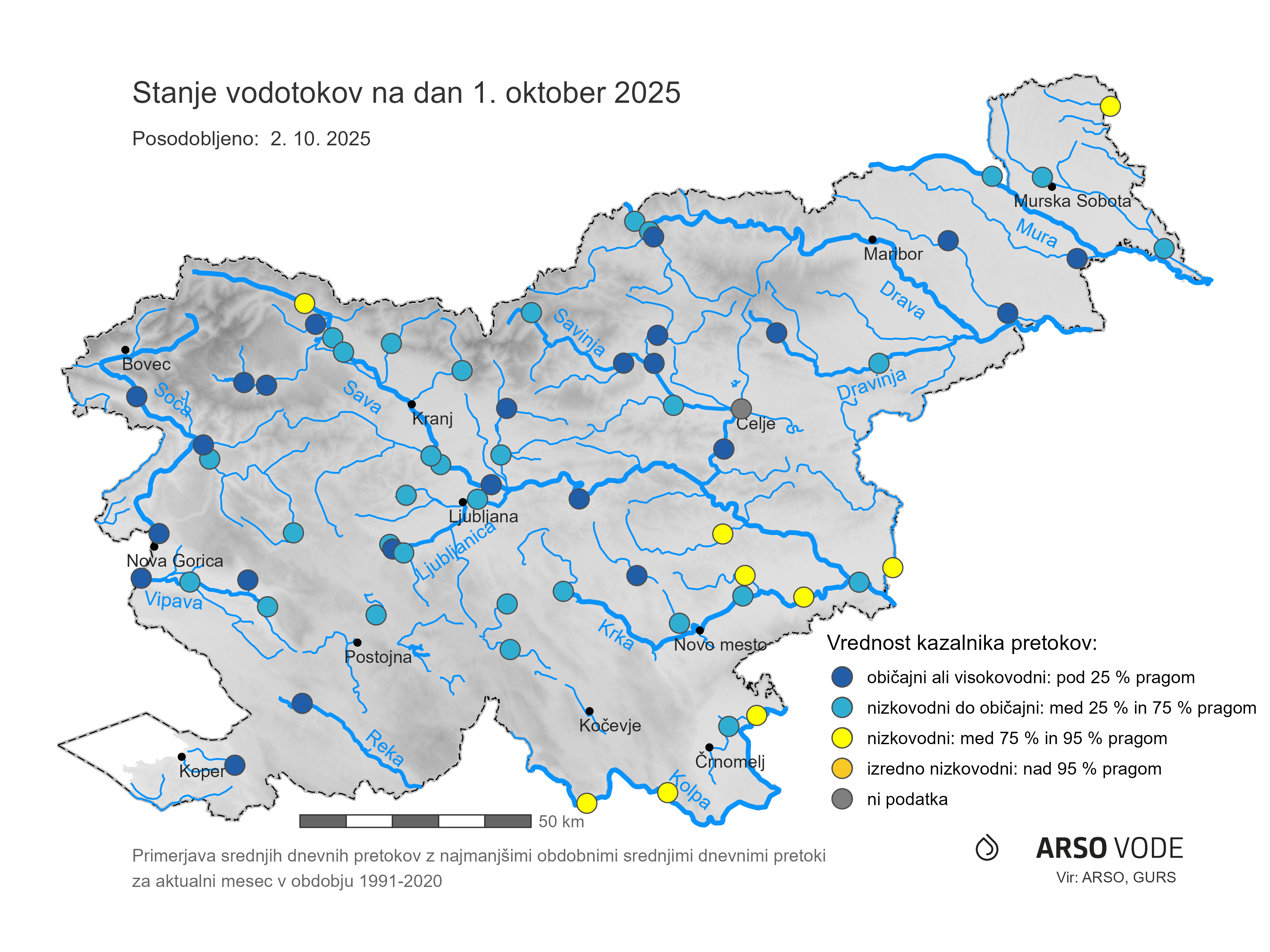 manjši od 25. percentila najmanjših dnevnih pretokov za tekoči mesec v obdobju 1991-2020 (25 odstotna
